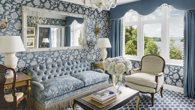 Quest'immagine di un castello inglese contiene elementi molto raffinati, l'accostamento cromatico è perfetto ma l'utilizzo di tante fantasie diverse rimpicciolisce la stanza, basterebbe in questo caso togliere la carta da parati dalla parete e dipingerla con un colore semplice e la stanza sarebbe perfetta.